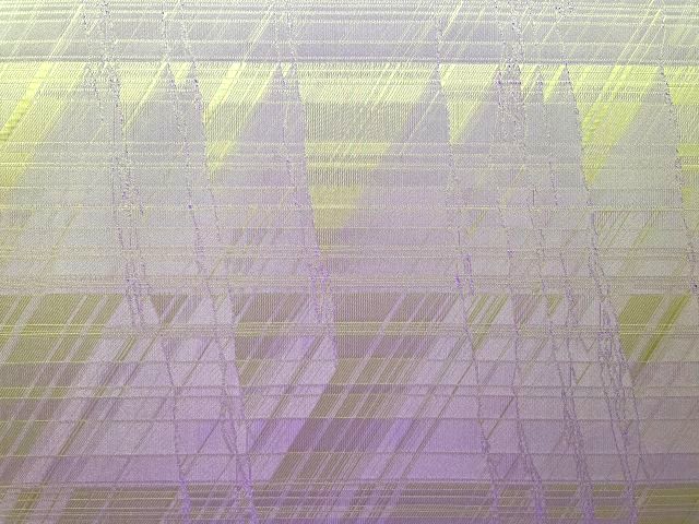 逆三角形のモチーフの組が構成され繋がっていく。その逆三角形の組を配置するための指針になるのが背景のセルオートマトンで描写されたグリッド。ドローイングとセルオートマトンのカップリング(組み合わせ)。
