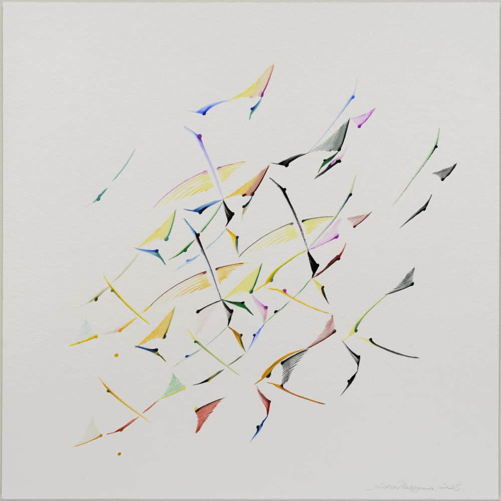 今回、2007年の学生時代の初期作品と、2014年に描いたドローイング、そして2025年の新作を合わせて展示している。このおよそ20年の間に、ドローイングの基本理念は変わっていないが、その線描の感触はだいぶ変化しているように見え、またパターンも緩やかに変容している。このように常に新しい自己を制作しながら、描かれたパターンを契機として次の行為を産出してゆく。